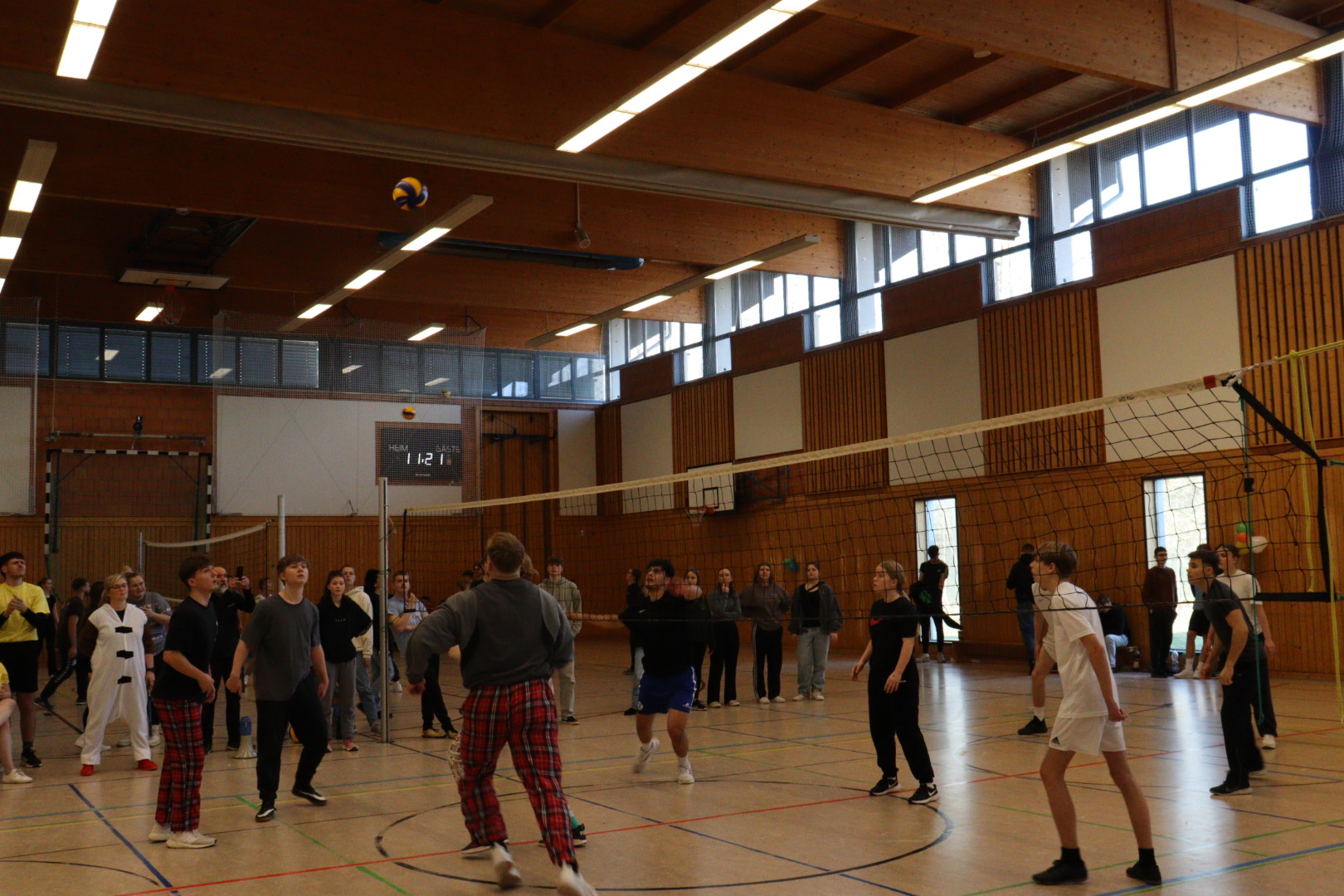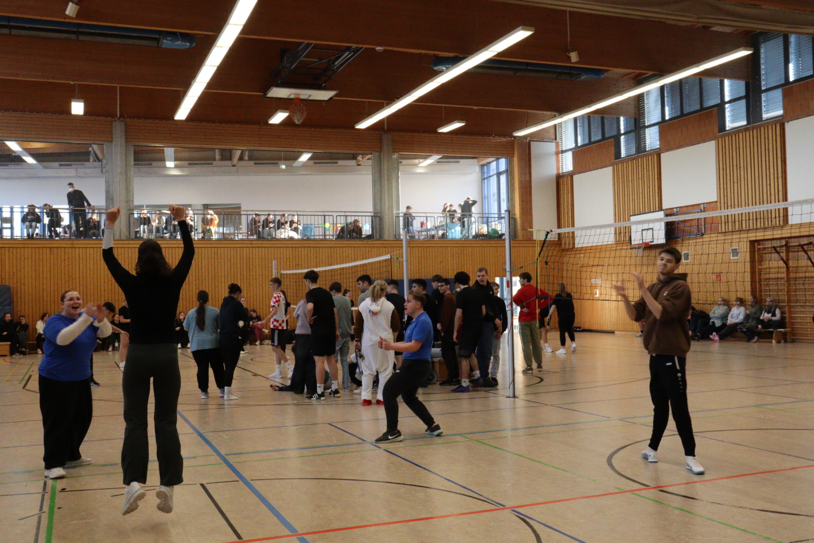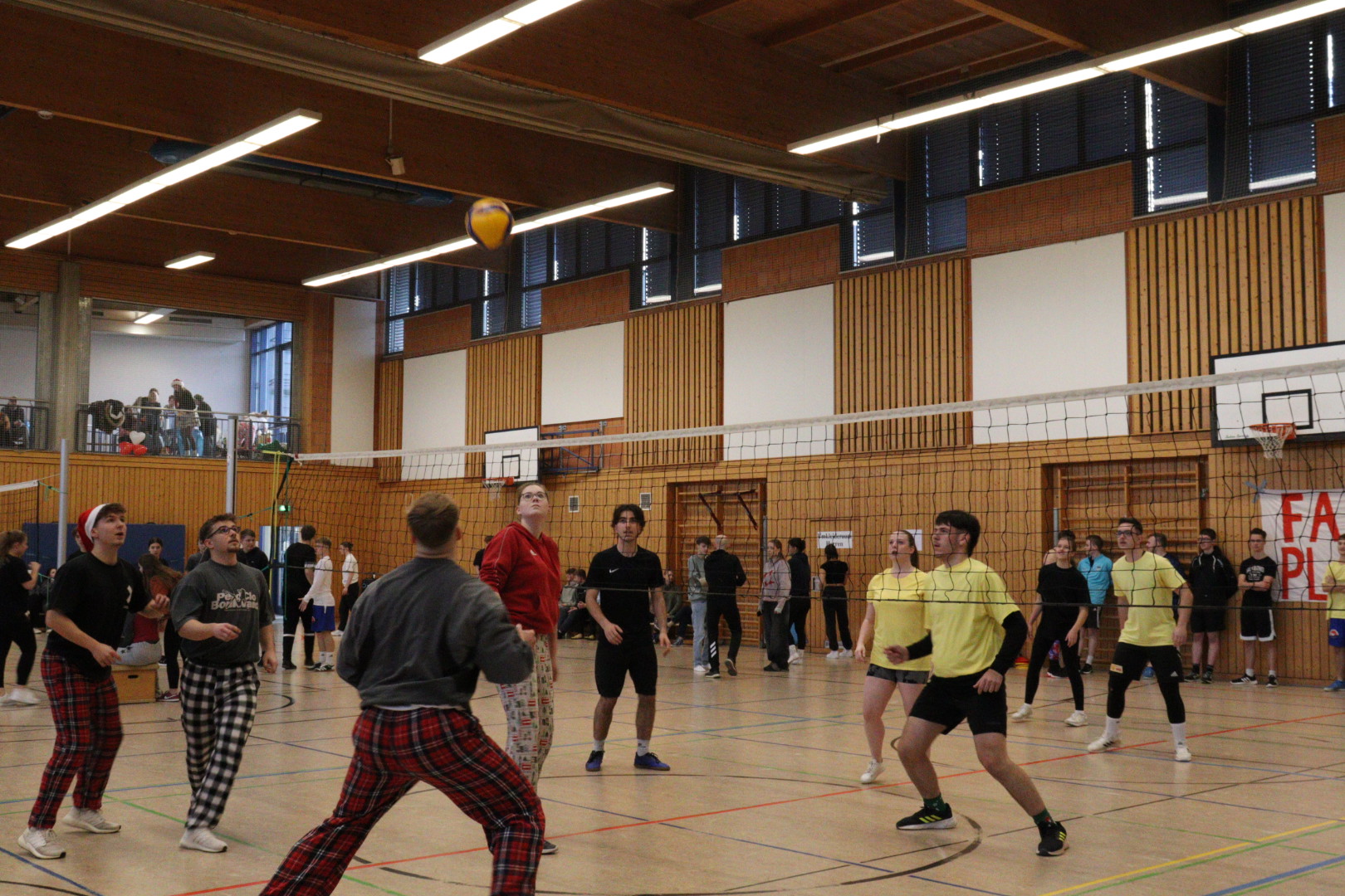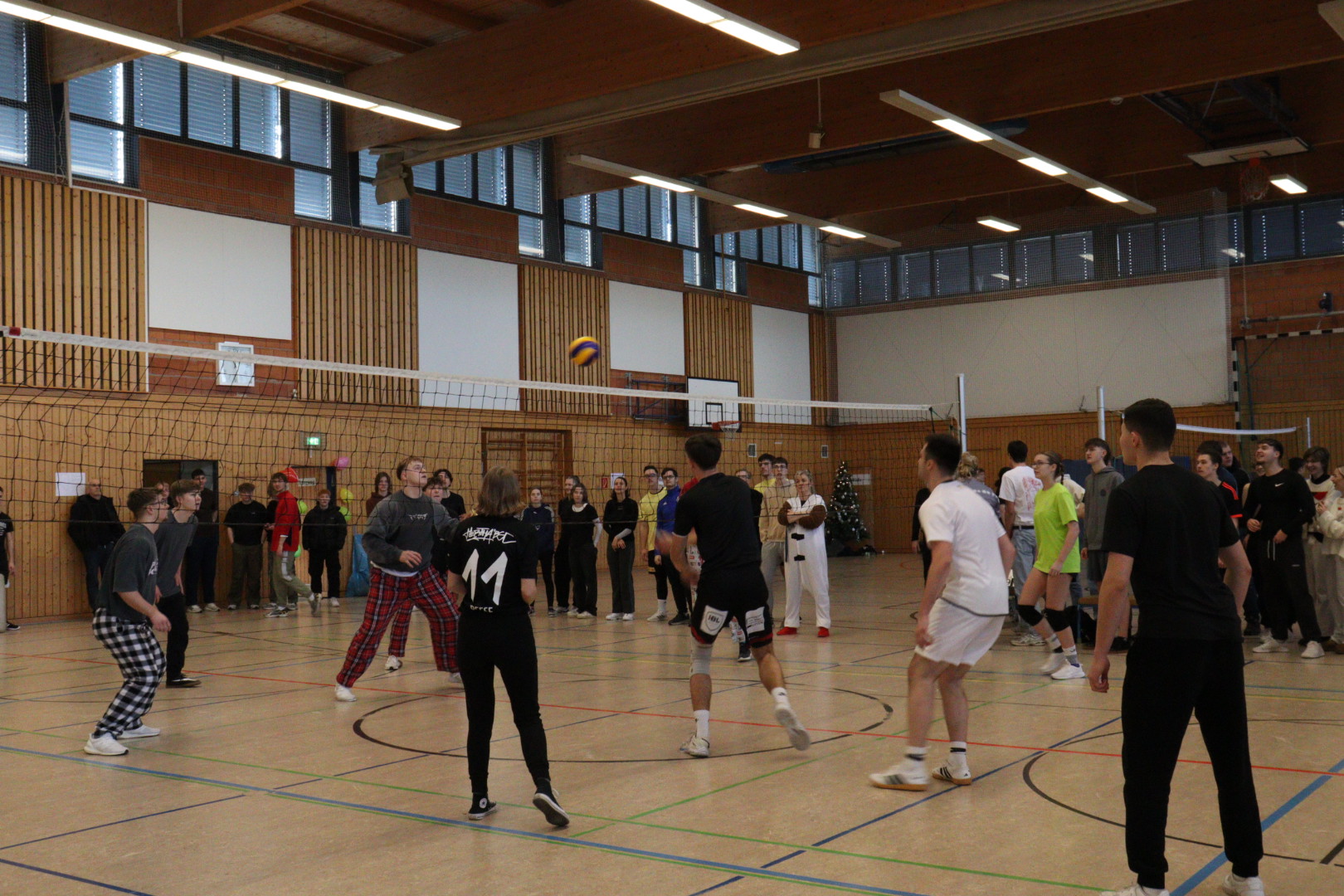 Alle Schüler*innen der gymnasialen Oberstufe trafen sich zum traditionellen VB -Turnier, welches durch Corona zweimal ausfallen musste. Doch in diesem Jahr hieß es wieder, gegeneinander anzutreten und den Wanderpokal zu erkämpfen. Jede Mannschaft wählte ein entsprechendes Outfit, Weihnachtsmusik lief nebenbei und für den Weihnachtsduft sorgten die fleißigen Wichtel der Jahrgangsstufe 12, die Waffeln und Crêpes anboten.